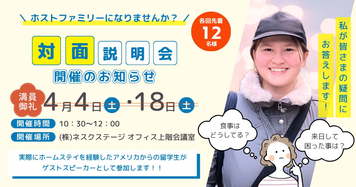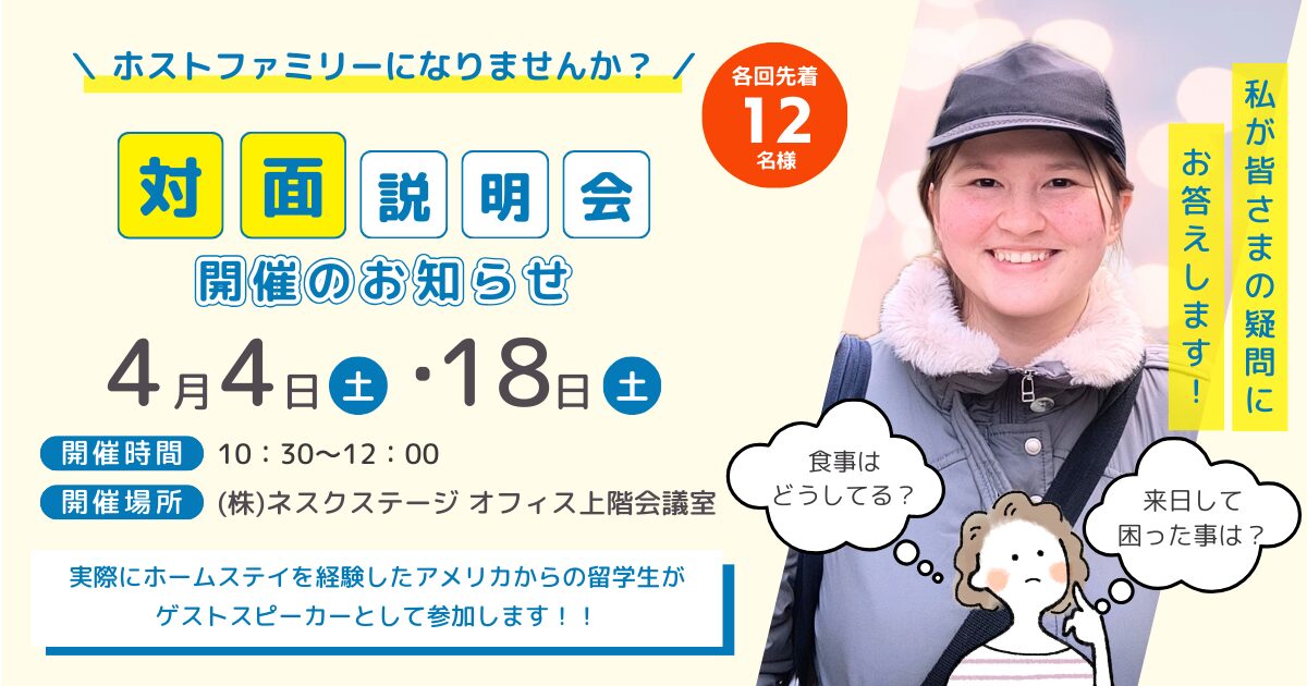 まずは弊社スタッフからホームステイお受入れについてご案内致します。その後、実際にホストファミリー宅でホームステイをしたことのあるアメリカからの留学生へ、ホームステイ生活についてみなさまからご質問いただけます!貴重な機会ですので、是非ご参加お待ちしております。